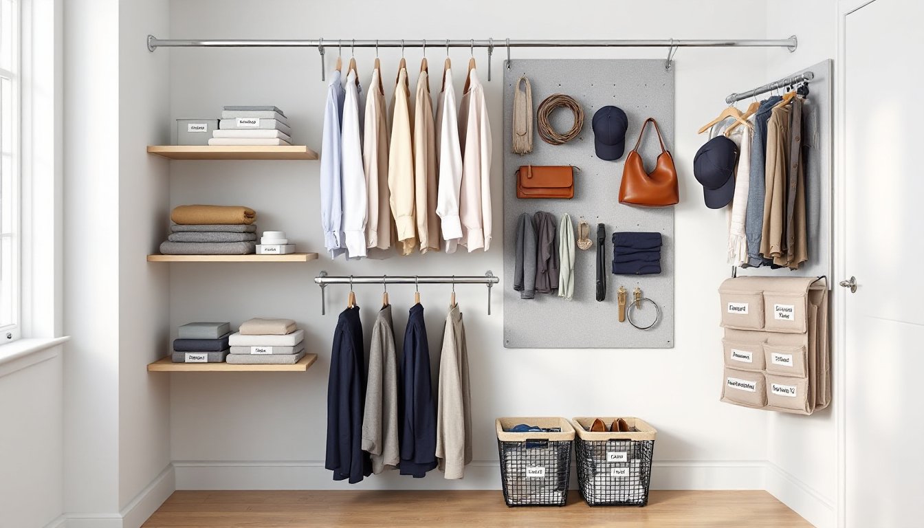 • Implement a seasonal rotation system by storing off-season clothes in breathable garment bags on high shelves, making room for current wardrobe essentials.