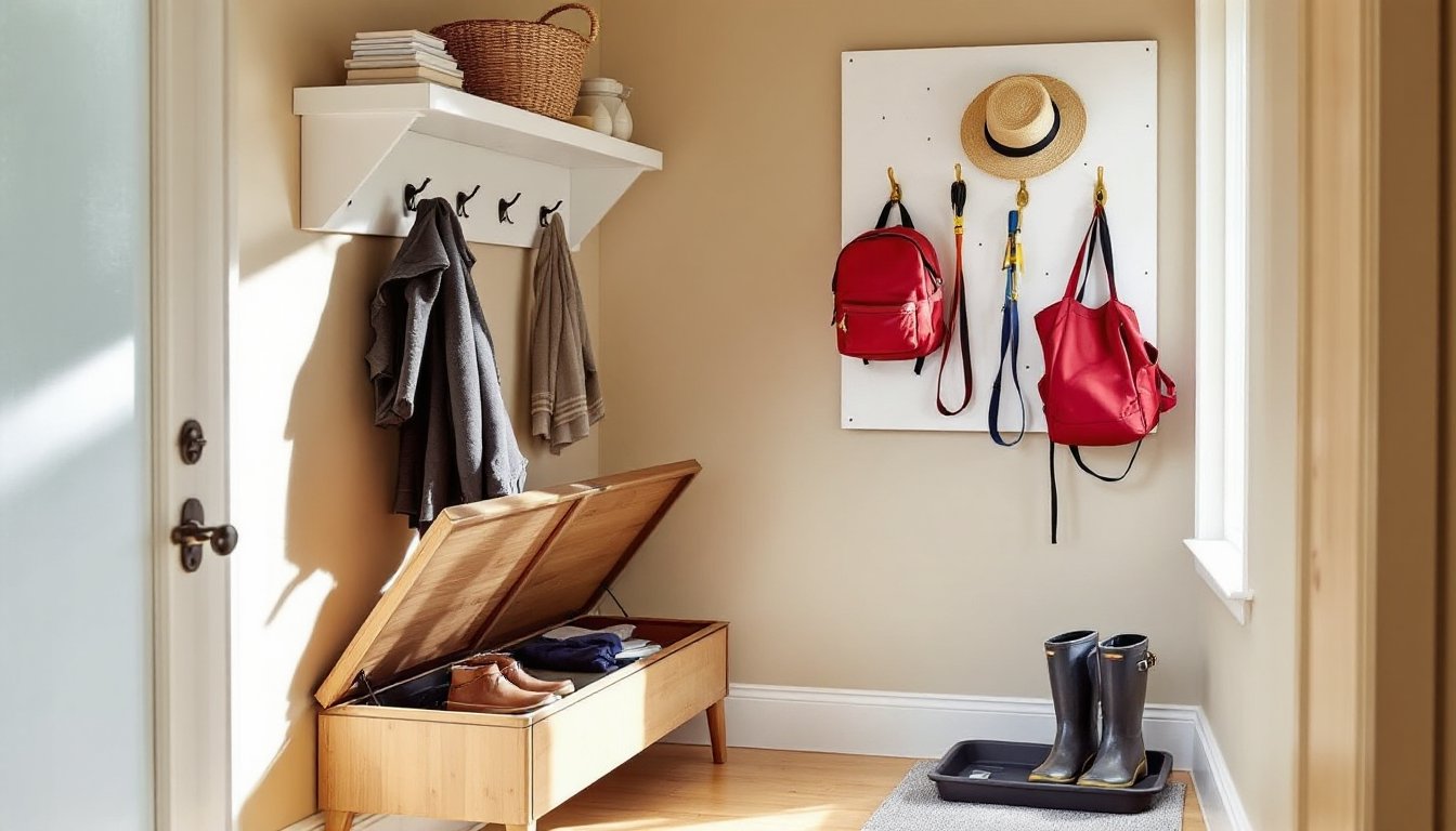 Wall hooks are the simplest upgrade. Mount them into studs (typically spaced 16 inches on center) or use toggle anchors rated for at least 50 pounds if hitting drywall only. Position hooks at varying heights: adult coats at 60–65 inches, kids’ gear lower at 40–48 inches, and a low row for bags or dog leashes around 30 inches. This keeps everyone’s items accessible without crowding.